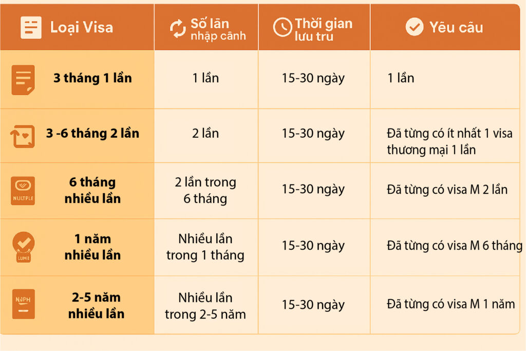 Thương mại 1 năm nhiều lần (Multiple) Nhiều lần trong 1 năm ≤ 30 ngày Đã có ít nhất 1 visa thương mại 6 tháng hoặc 6 visa thương mại trước đó Phù hợp chủ DN, quản lý cần đi lại nhiều